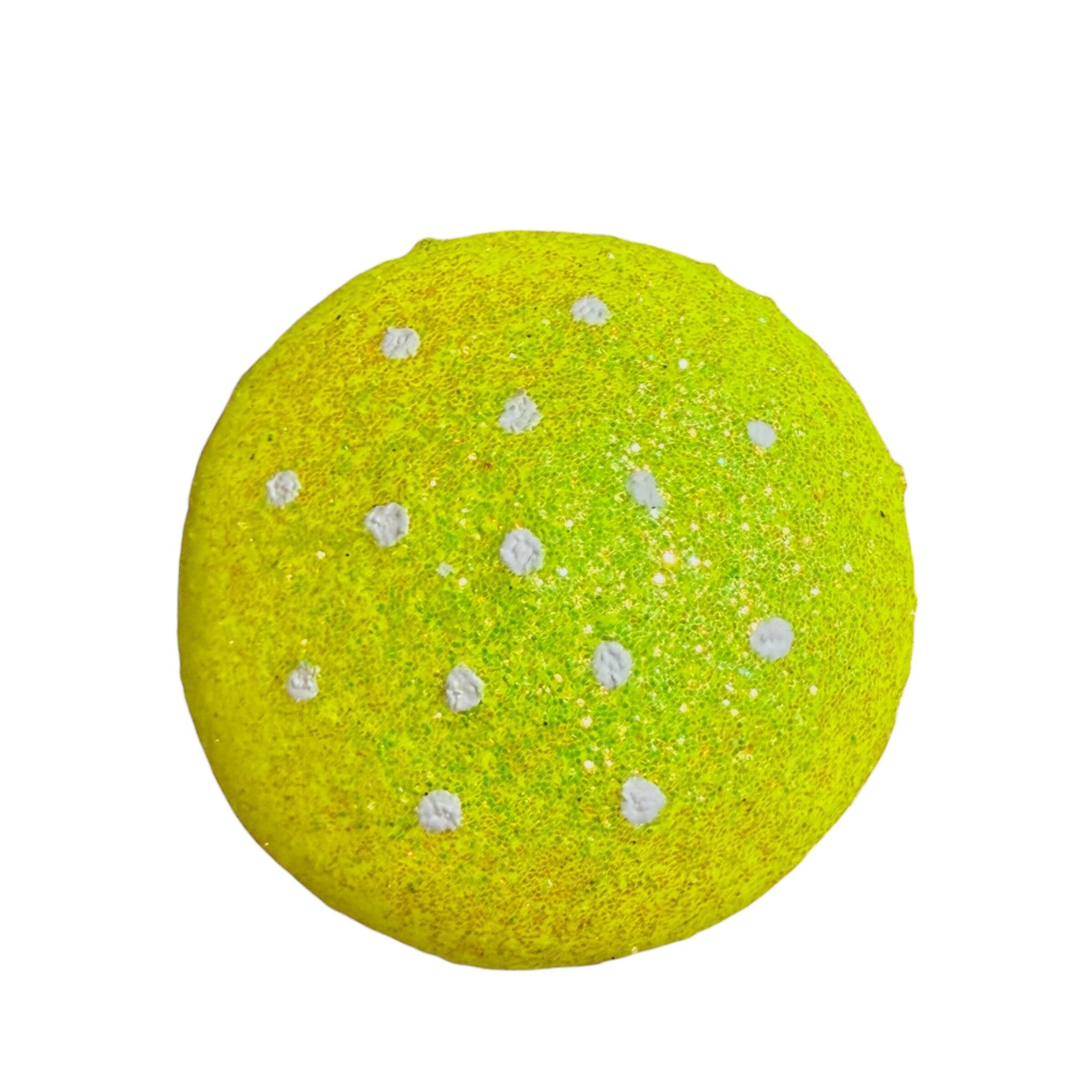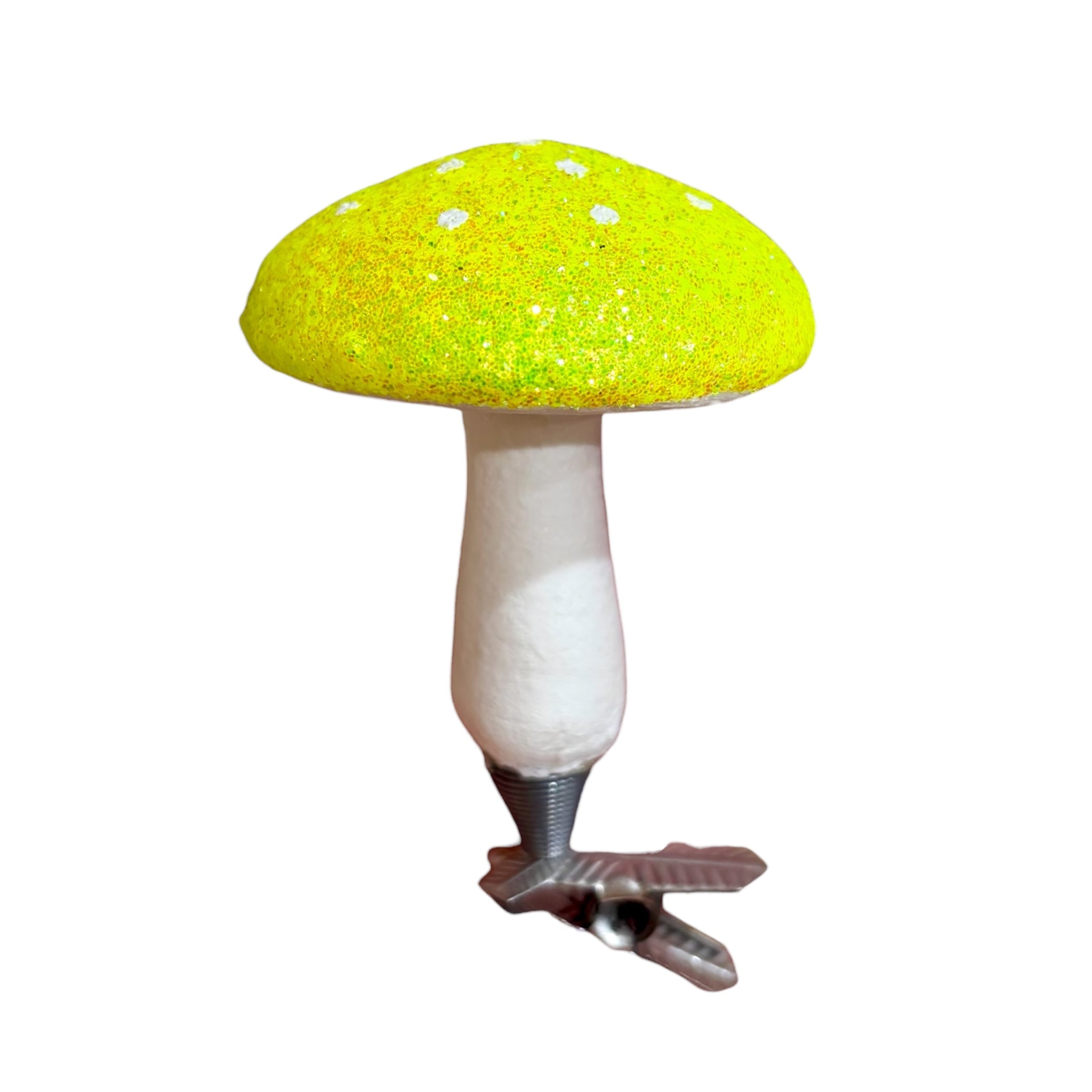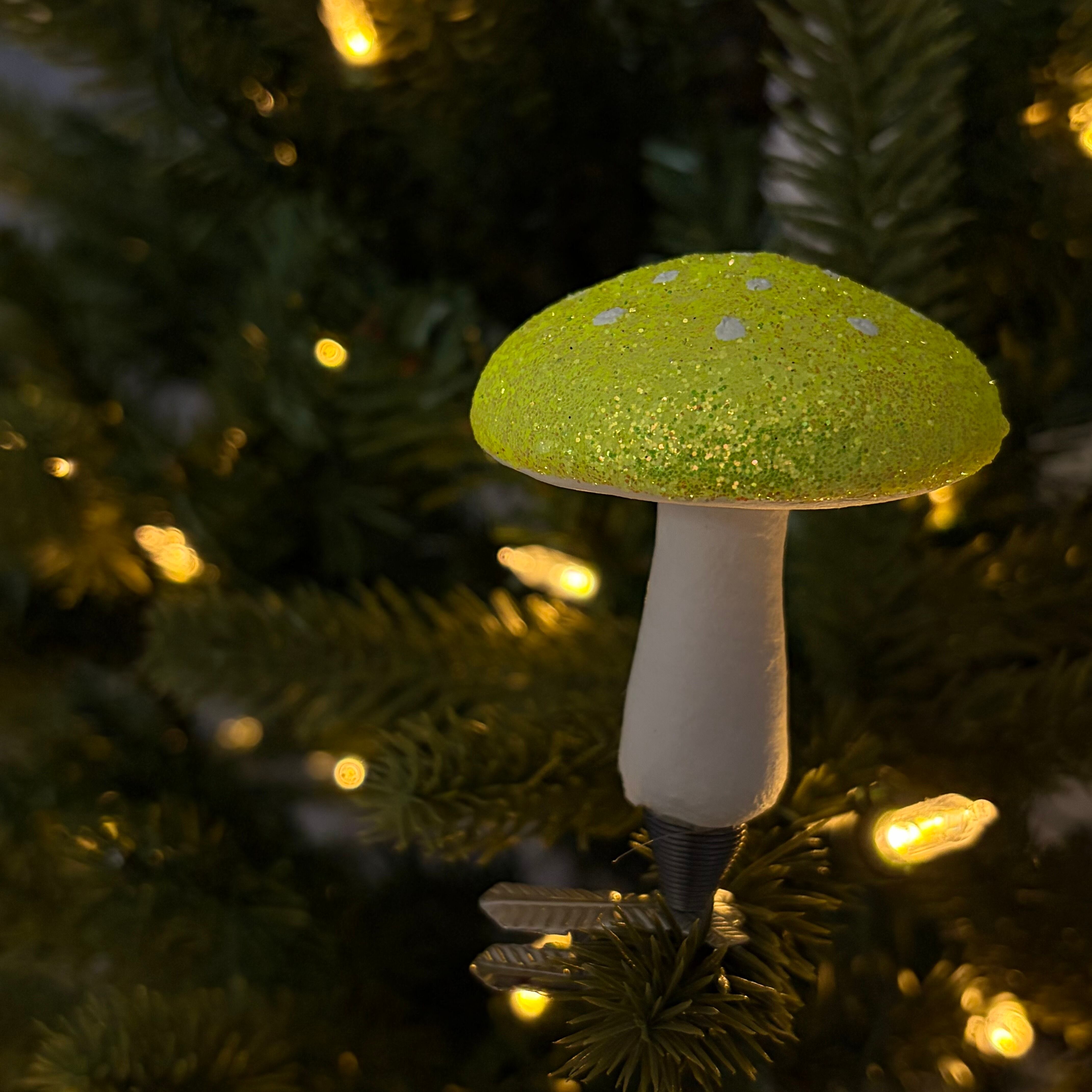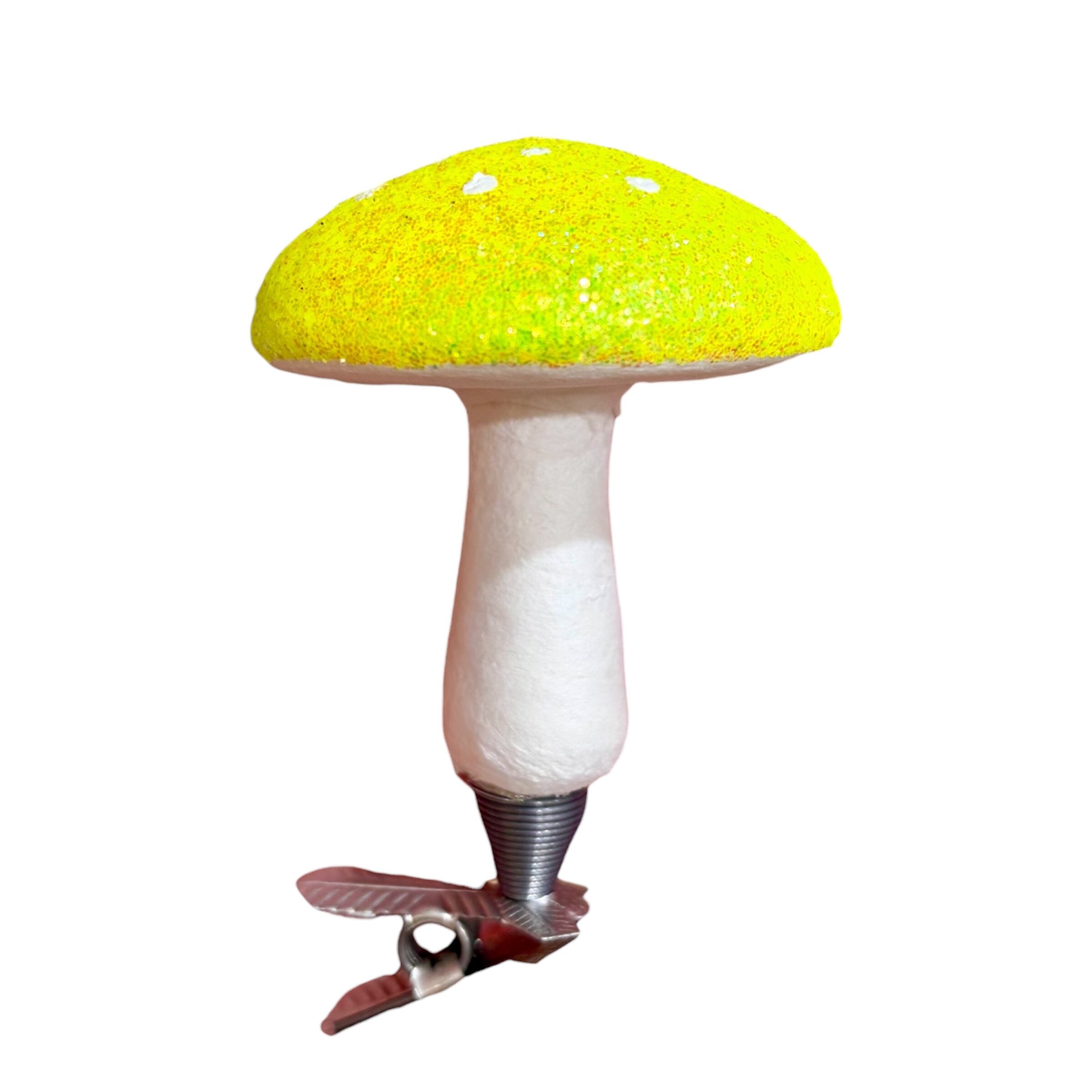 セルロースコットンを手で回しながら形成し、着色ゼラチンでコーティングし、手描きでドットを描いたキノコのクリップオーナメント。