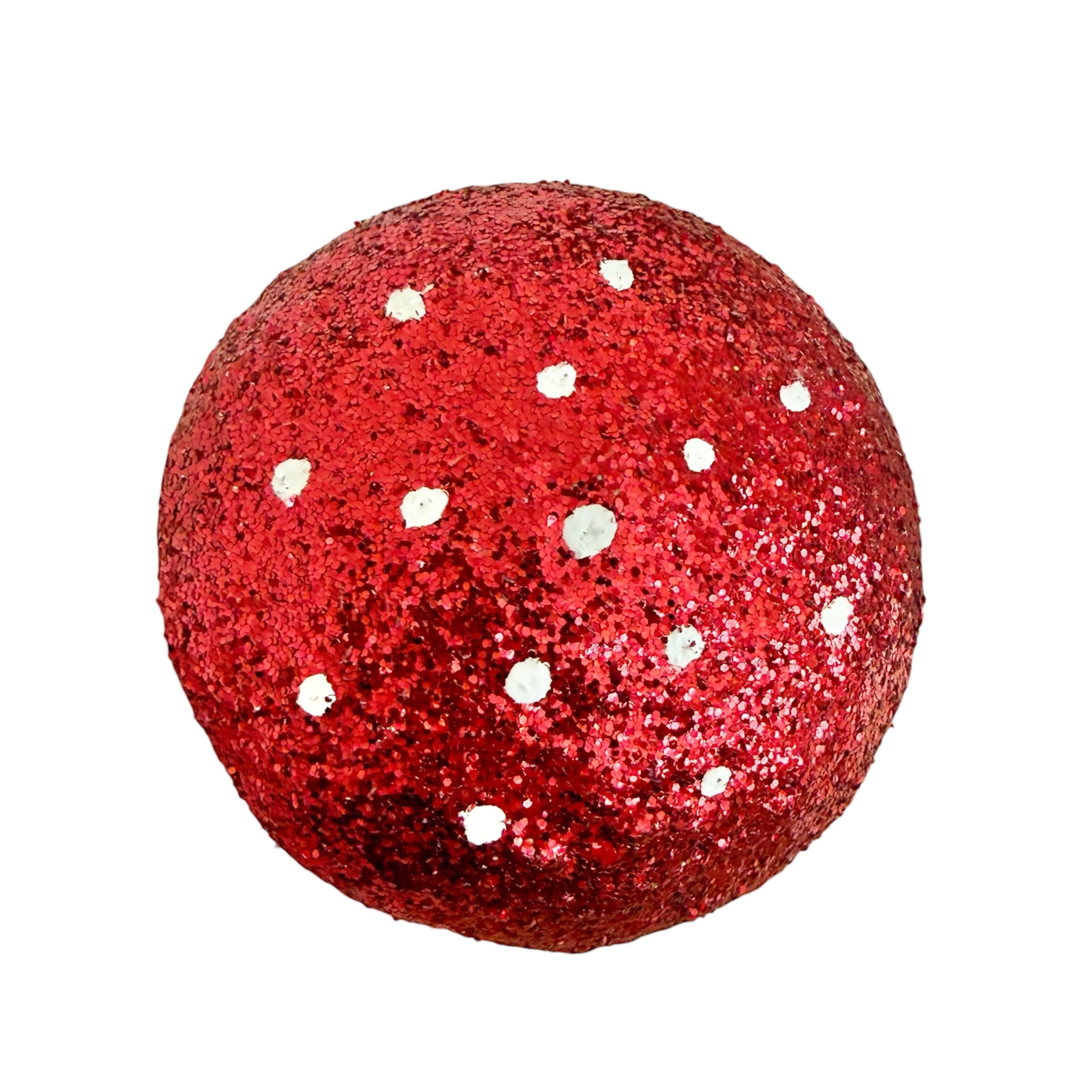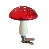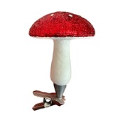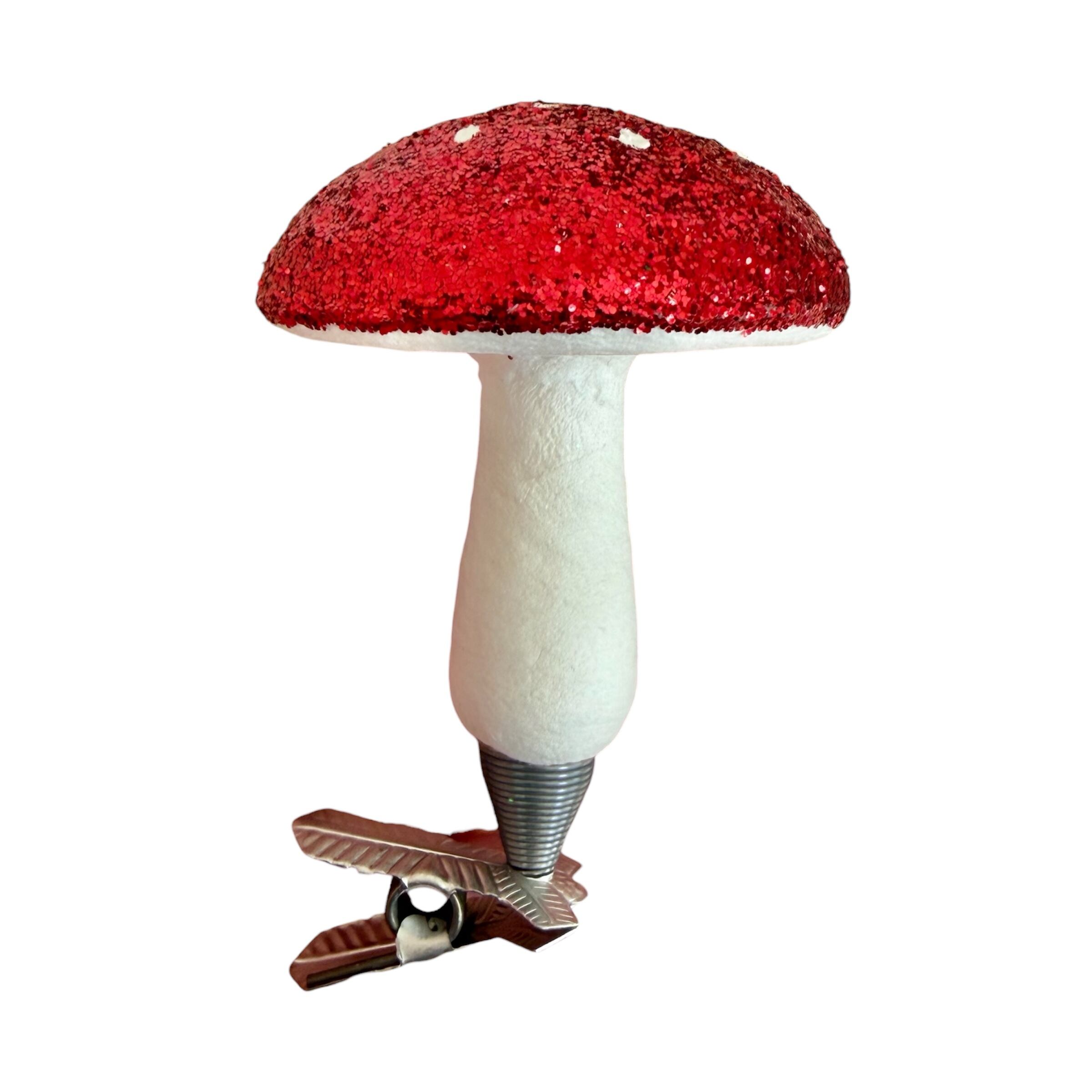 セルロースコットンを手で回しながら形成し、着色ゼラチンでコーティングし、手描きでドットを描いたキノコのクリップオーナメント。