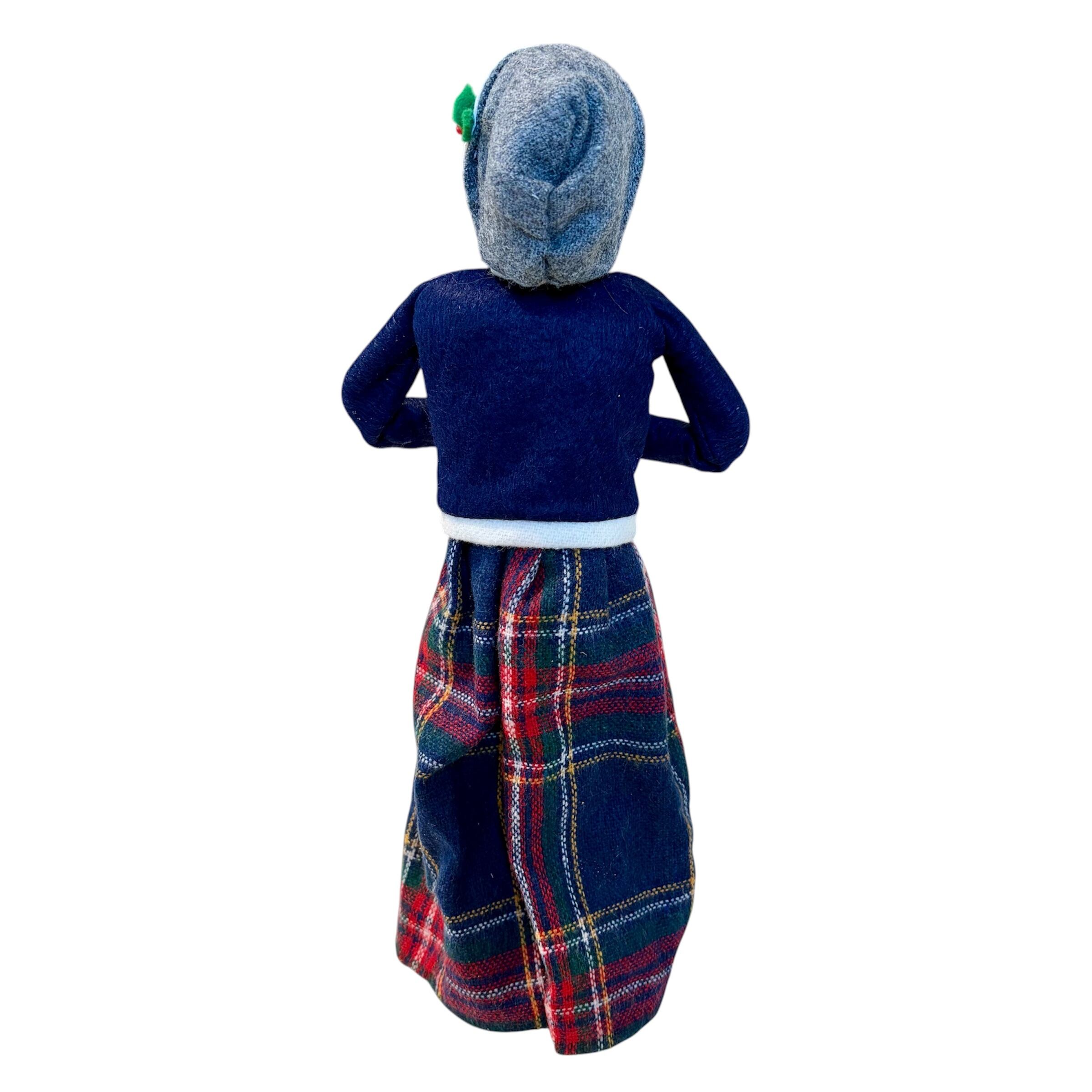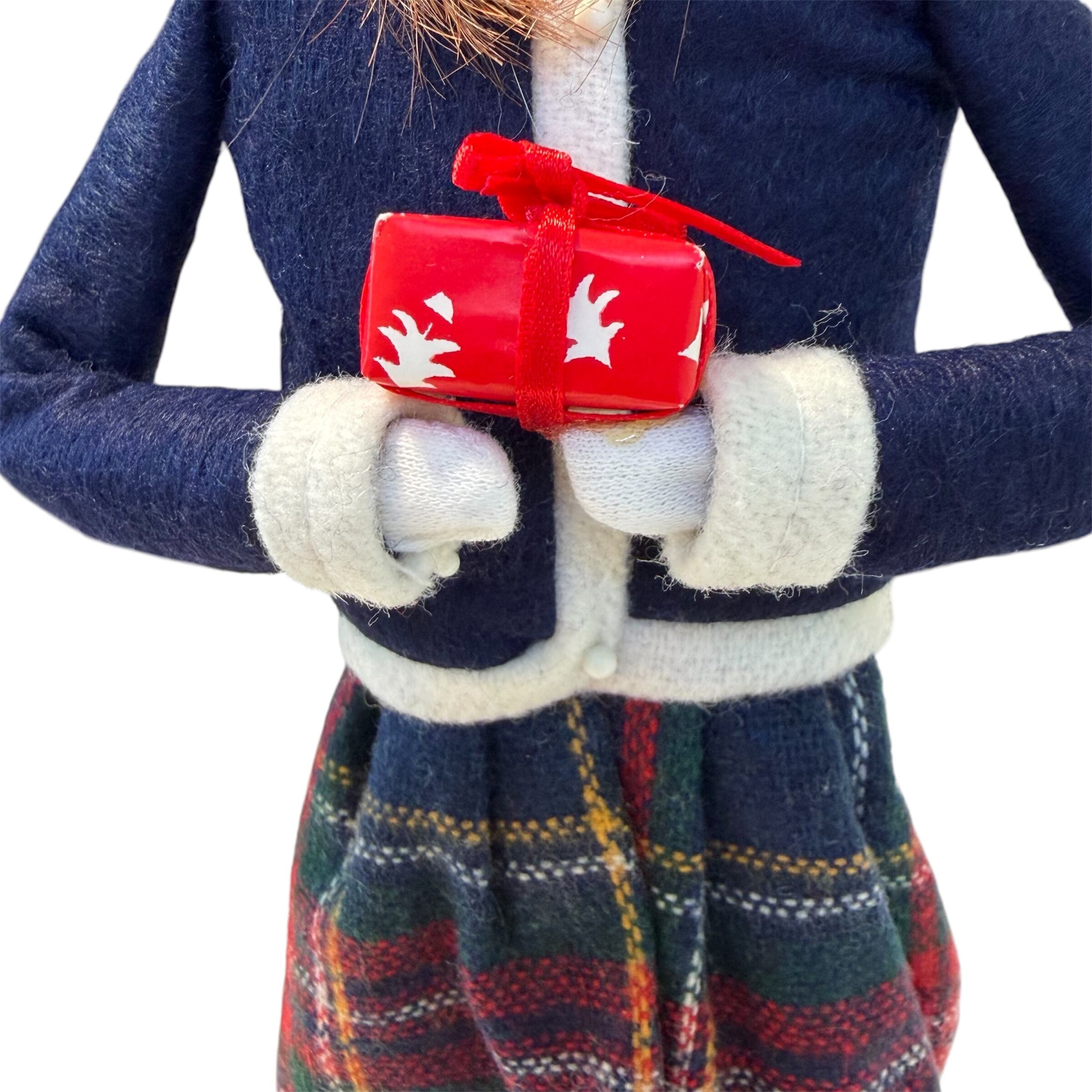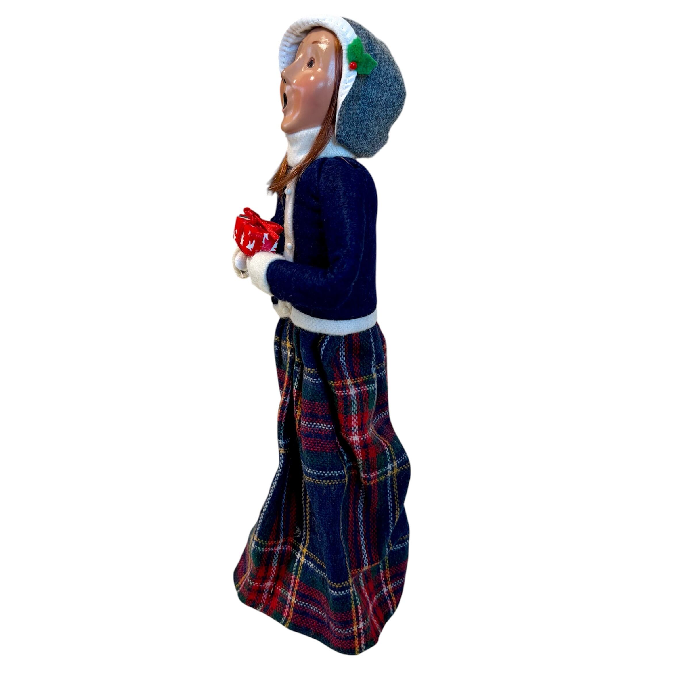 あたたかそうな服装に身を包んだ女性が、プレゼントを持ってクリスマスキャロルを歌っています。チェック柄のスカートがクリスマスらしさを一層引き立ててくれます。