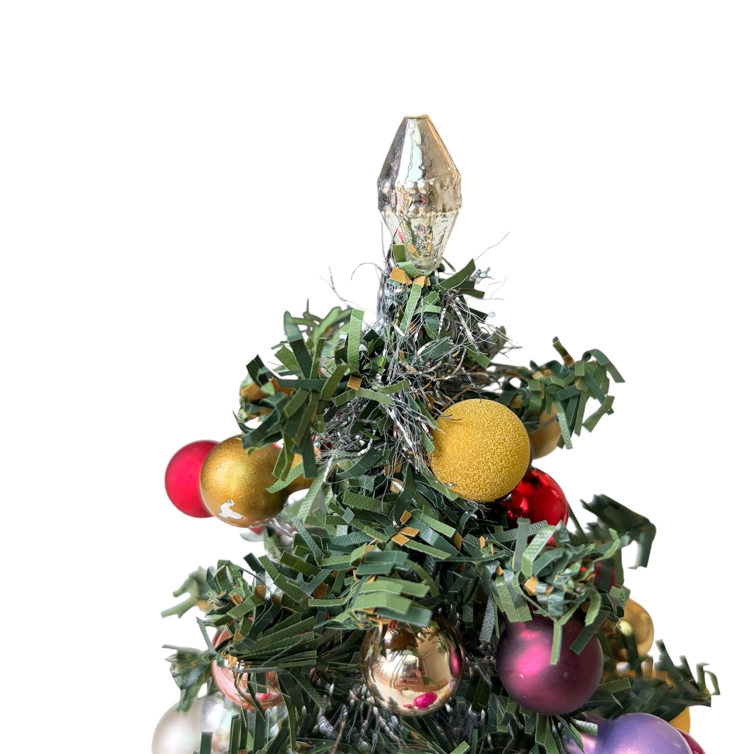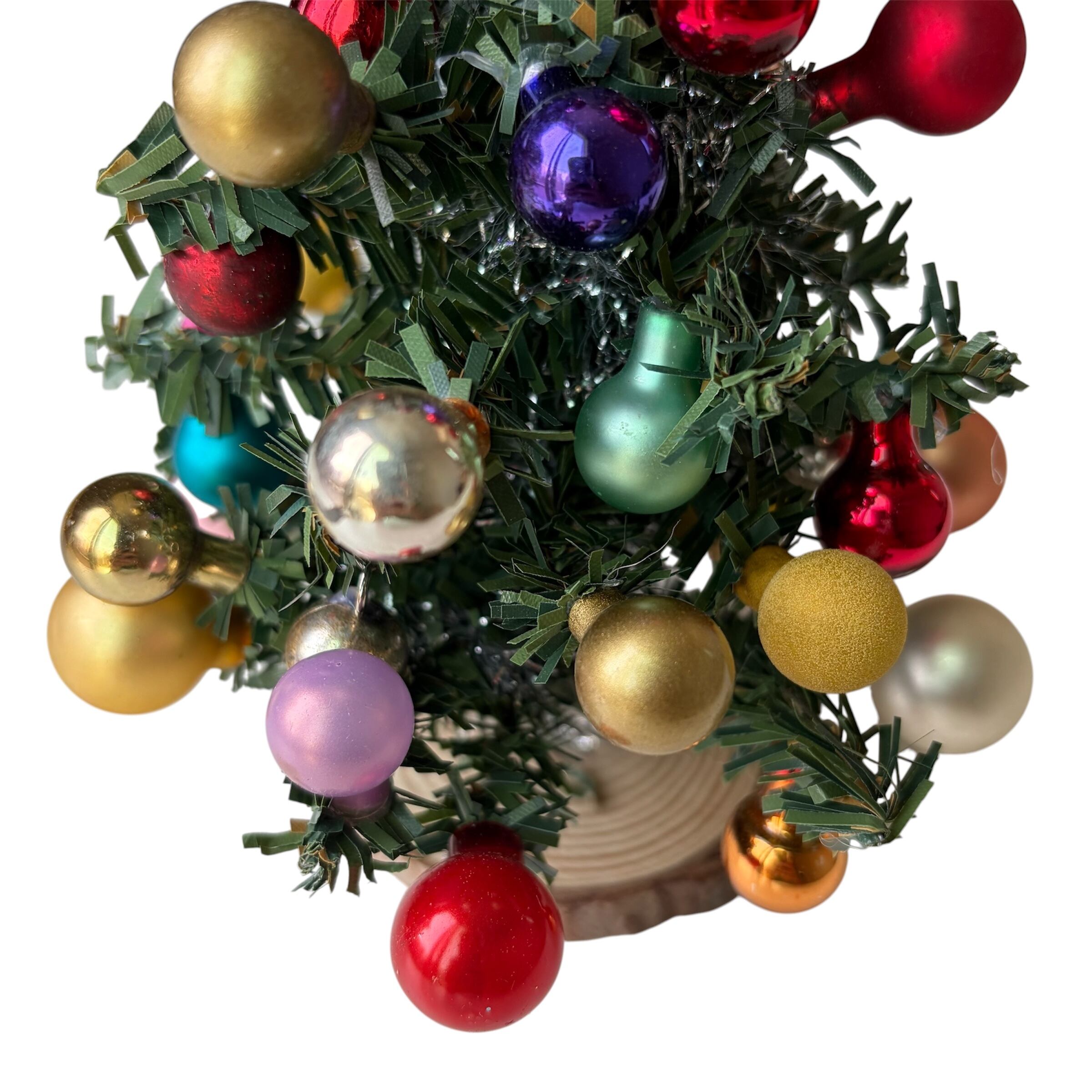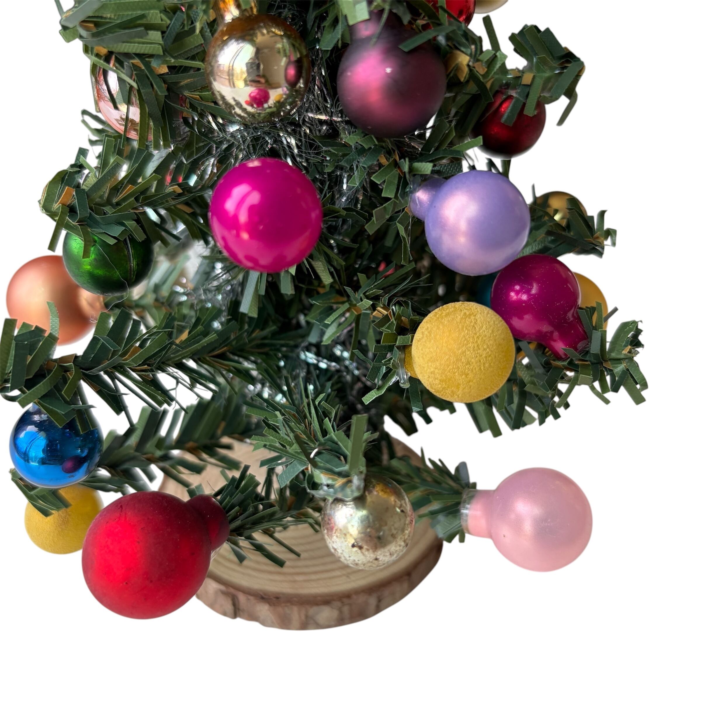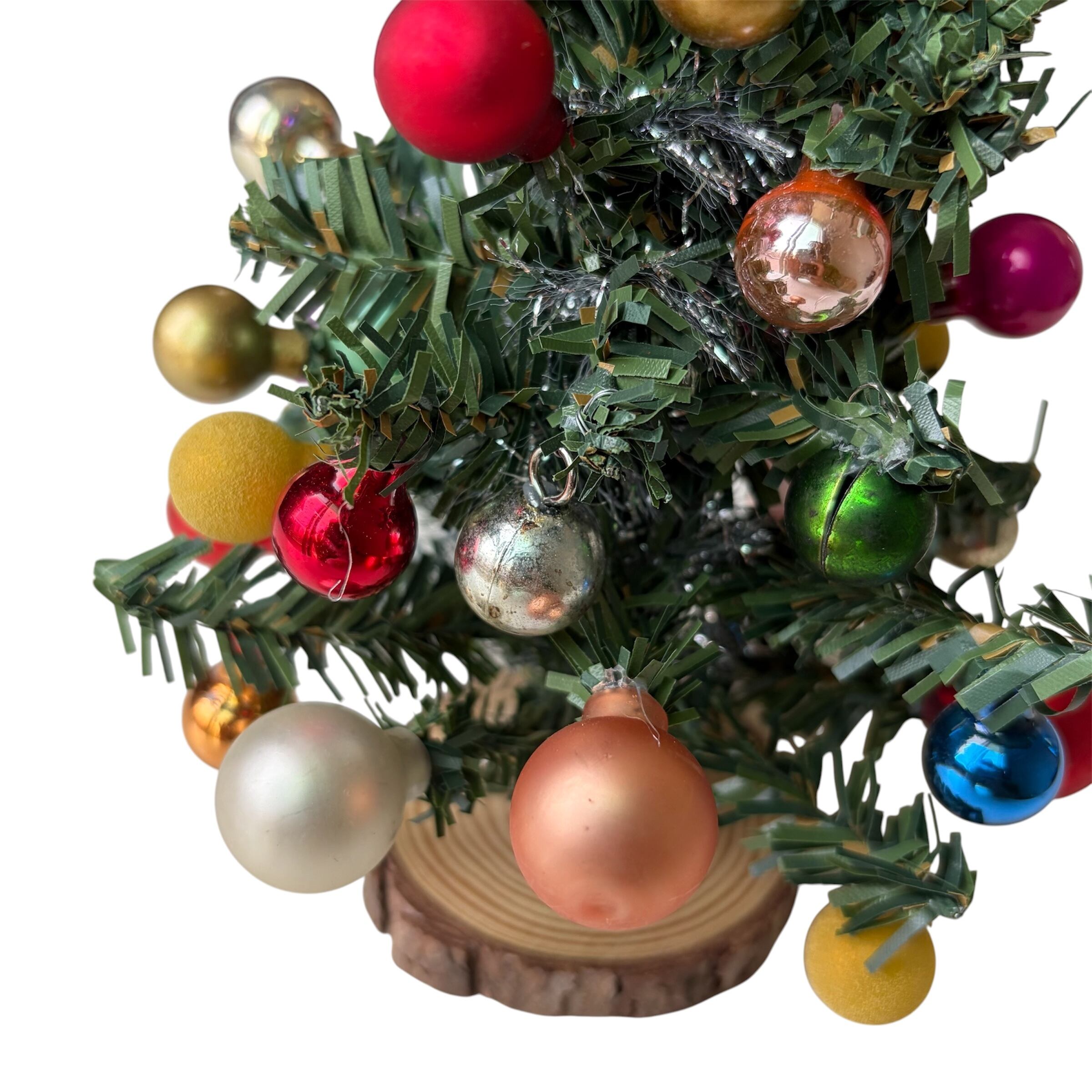 ハンドメイドで作られたノスタルジックなミニツリー。小さなガラスボールやアンティークミニボール、ティンセルでデコレーションされています。手作業で丁寧に作られているため、各ツリーは一点もので特別なアイテムです。一部オーナメントの継ぎ目が剥がれていますがアンティークの部品のためご了承ください。ご使用には問題ございません。