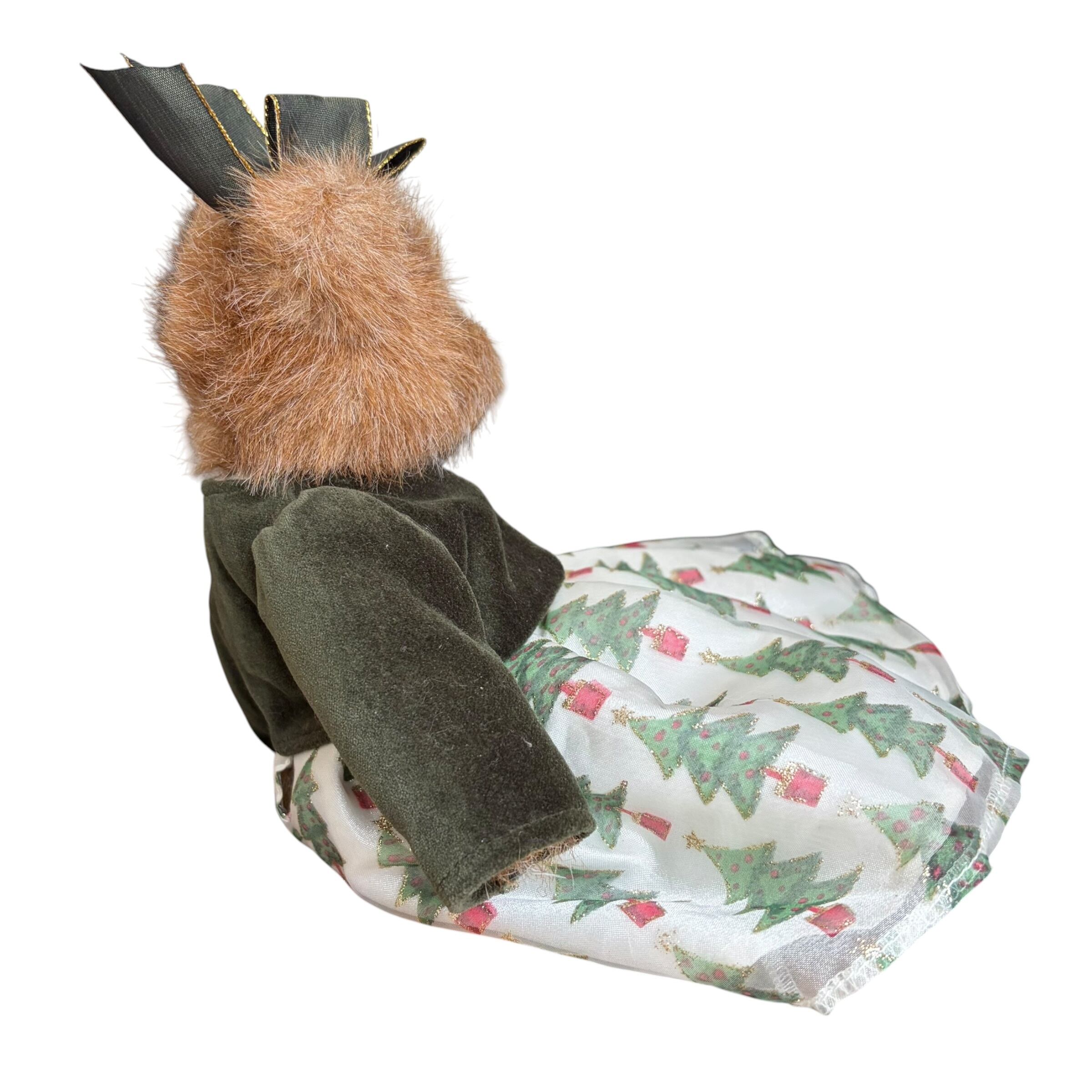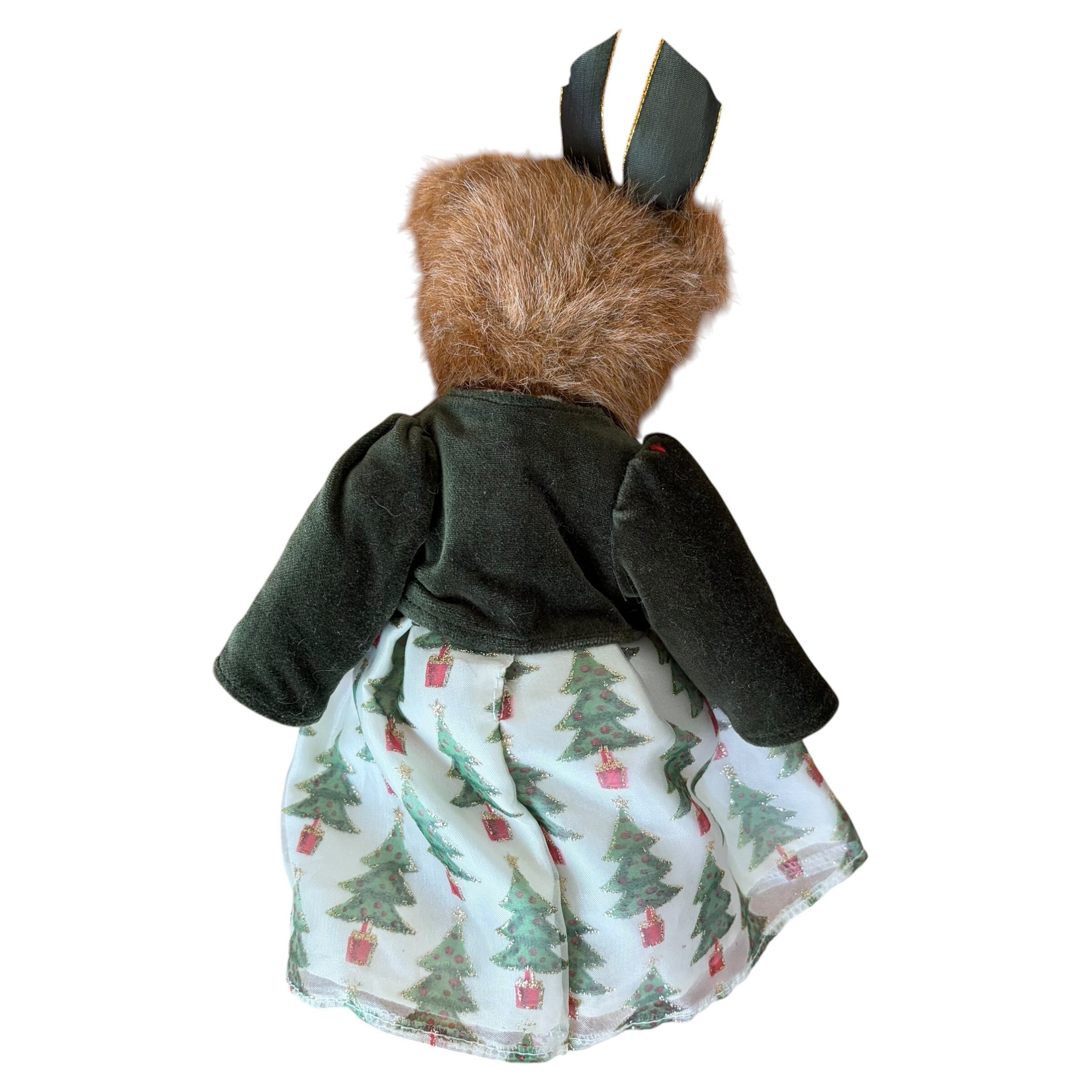 ヴィンテージのクリスマステディベアです。クリスマスツリーの刺繍やキラキラしたスカートがクリスマスらしさを一層引き立てます。