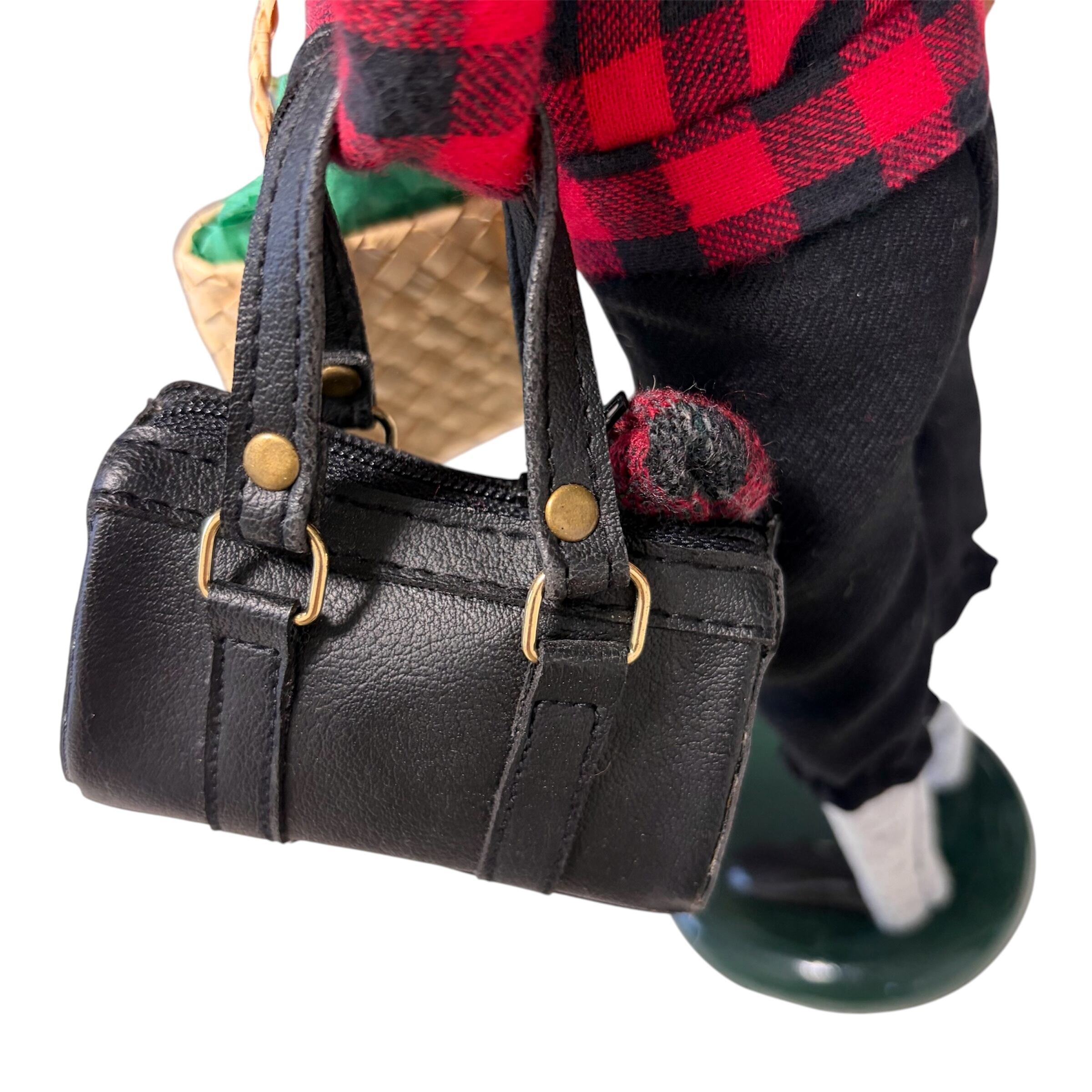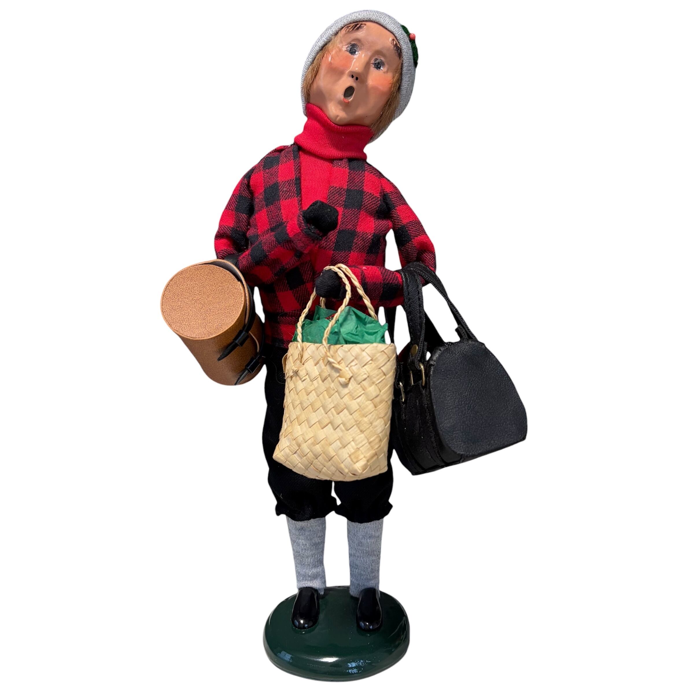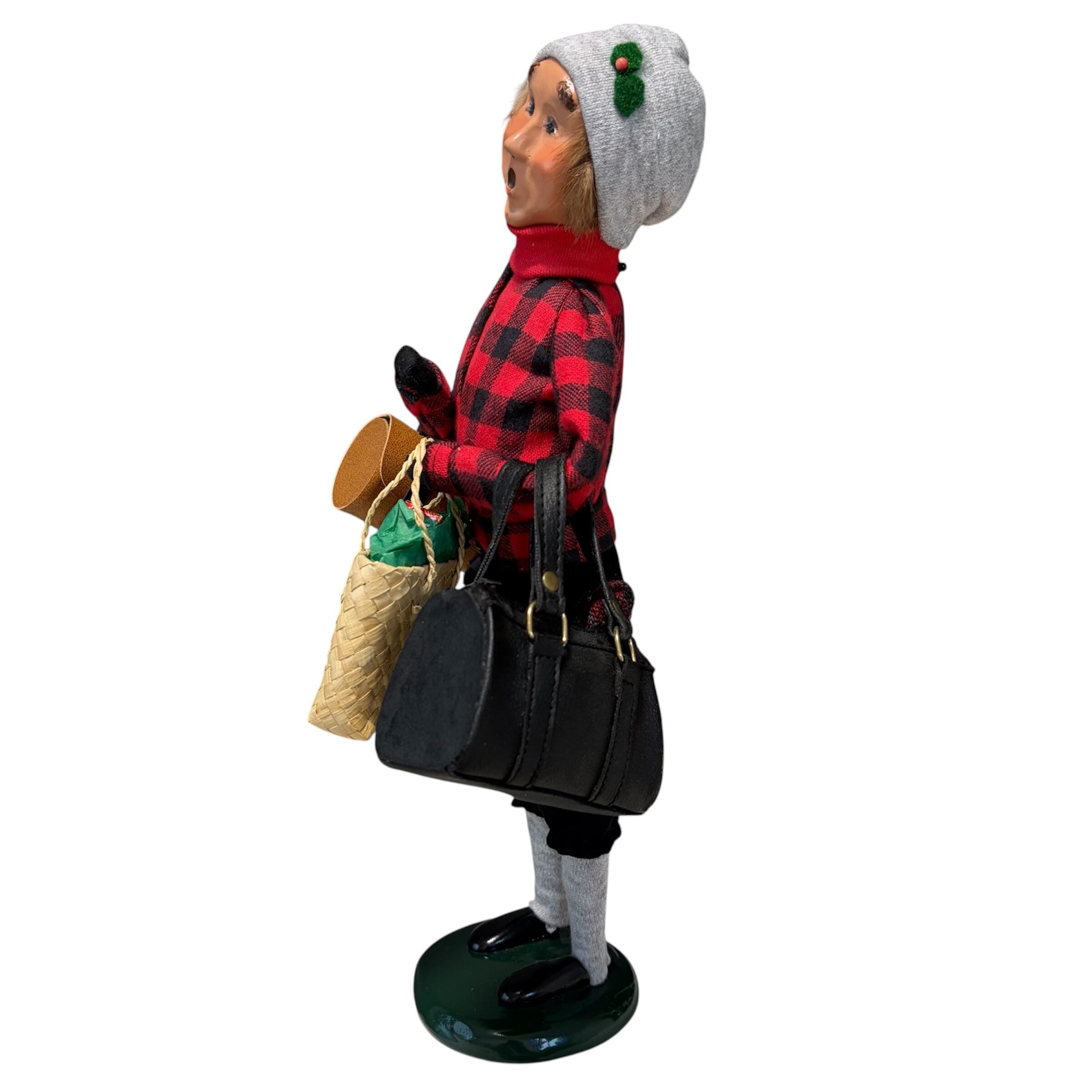 アメリカのクリスマスらしいレッドとブラックのチェック柄のな服装に身を包んだ男性が、両手いっぱいの荷物を持ってクリスマスキャロルを歌っています。彼はトラベラー。クリスマスに旅行から帰ってきたのでしょうか。忙しくても一生懸命にキャロルを歌っています。
